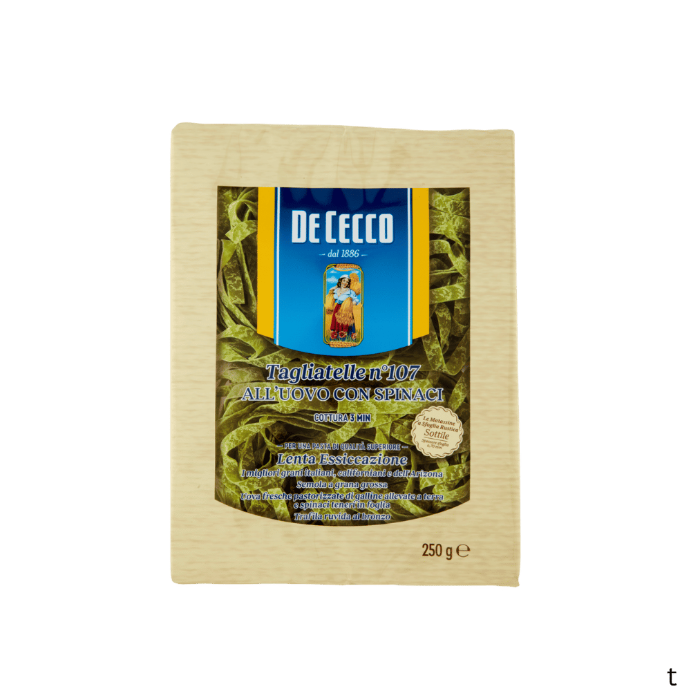 Produkto aprašymas: Aukščiausios kokybės kiaušininiai tagliatelle makaronai su šviežiais špinatais. Pagaminti pagal tradicinį De Cecco receptą su šviežiais pasterizuotais vištų kiaušiniais iš laisvai laikomų vištų ir švelniais špinatų lapais. Plona rustikiška tešla (storis 0,70 mm), brūkšniuota per bronzą, lėtai džiovinta. Idealūs su sviesto, grietinės ar sūrio padažais.