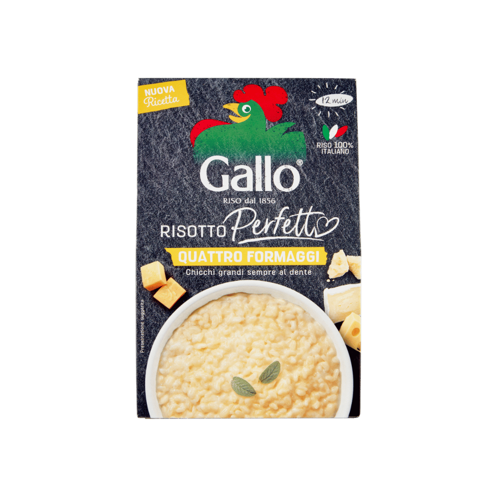 Aprašymas: Paruoštas sausas risotto mišinys su keturiais sūriais (camembert, pecorino, emmenthal, cheddar ir kiti). 100 % itališkas parboiled ryžius, dideli chicchi, kurie išlieka al dente. Nauja vegetariška receptūra, be dirbtinių aromatų ir dažiklių, be pridėtinio glutamato, be konservantų (dėl apsauginės atmosferos pakuotėje). Paruošiamas per 12 min. – 2 porcijoms.