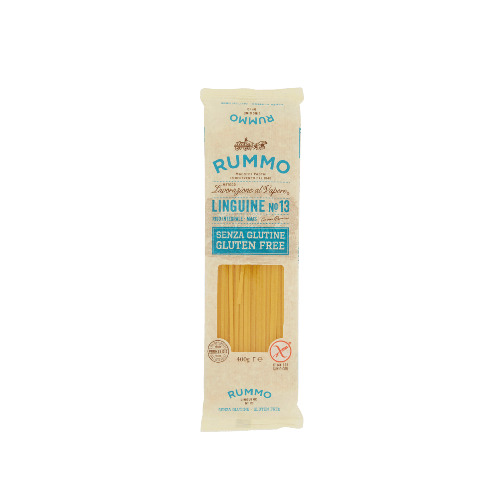 Aprašymas: Be glitimo linguine (plokšti makaronai) Nr. 13, specialiai sukurti celiakija sergantiems. Pagaminti iš rudųjų ryžių ir kukurūzų, naudojant unikalų garų apdorojimo metodą (Metodo Lavorazione al Vapore) ir bronzinį trafilavimą – tekstūra rupi, puikiai laiko padažą, konsistencija artima klasikinei pastai. Kosher sertifikuota, tinkama celiakams.